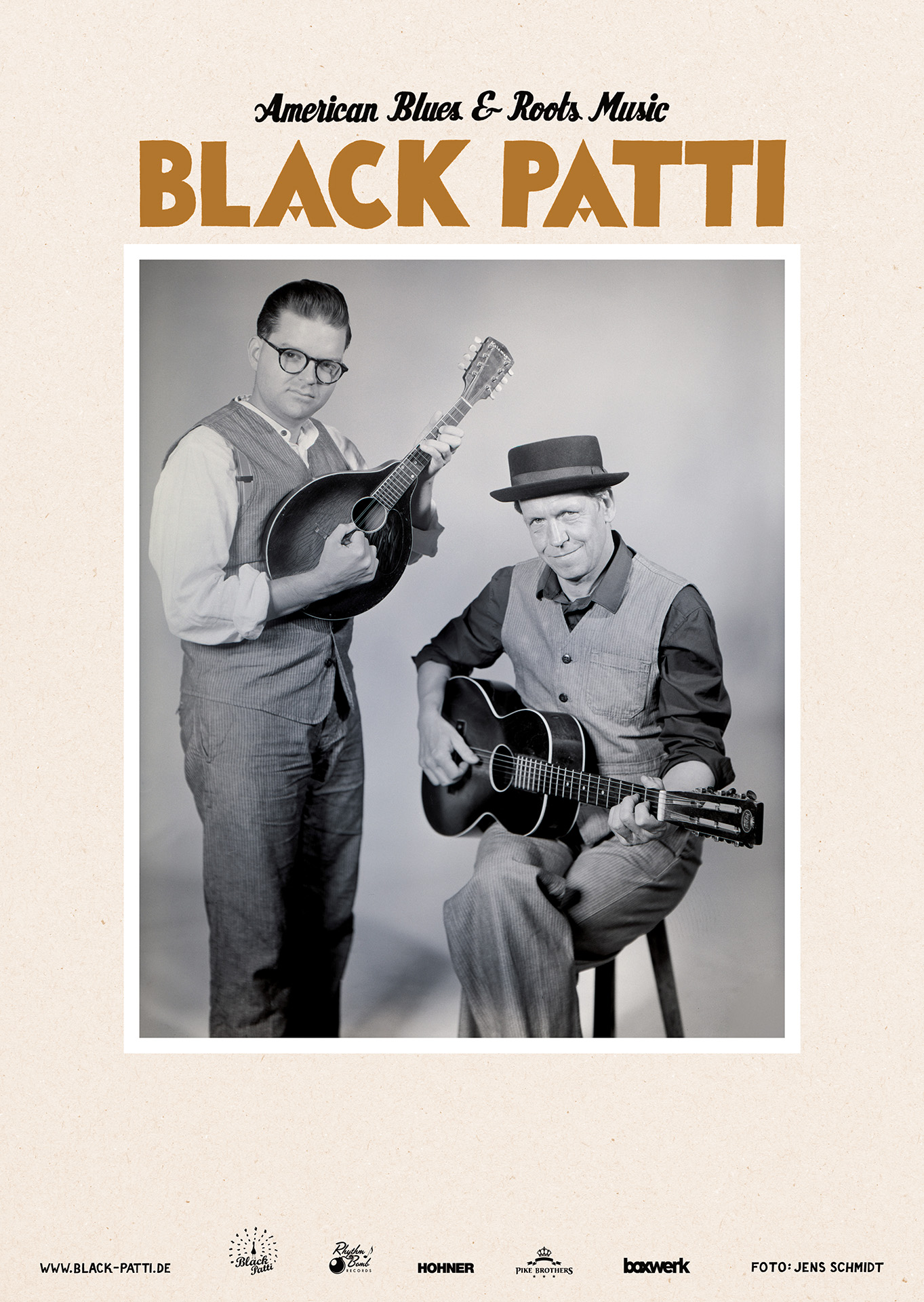 Black Patti – das sind Peter Crow C. und Ferdinand „Jelly Roll“ Kraemer. Seit über 10 Jahren sind die zwei Blues & Roots Musiker auf internationalen Bühnen und Festivals gemeinsam unterwegs. Zweistimmig, handgemacht und unzensiert erzählt das mehrfach prämierte Duo in seinen Songs Geschichten, die das Leben schreibt.
